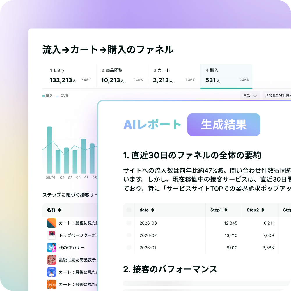 膨大なカスタマーデータからAIが行動傾向や推移、施策の効果を要約。次に取るべきアクションの示唆を得ることができます。