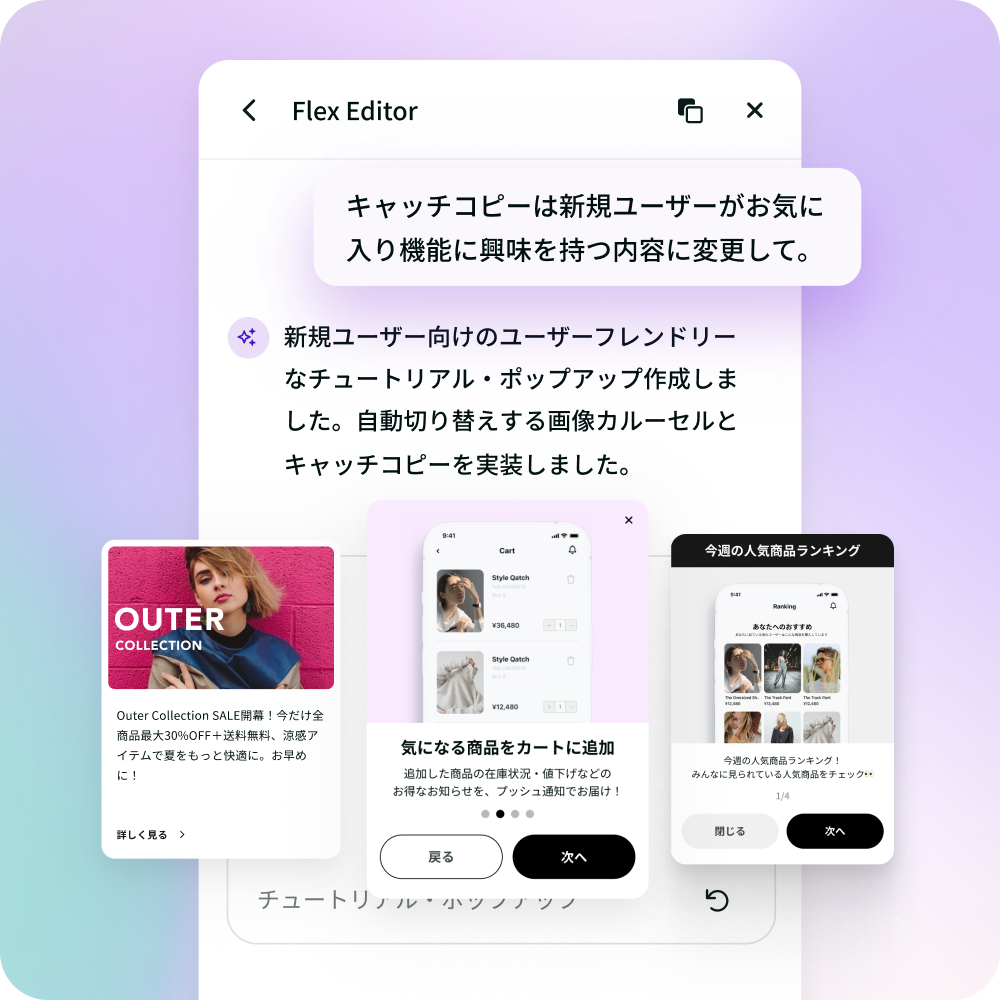チャット形式で指示するだけで、AIがポップアップの文言生成やレイアウト生成を行います。生成された施策をカスタマイズして効率よく配信することができます。AIのサポートにより、アイデアをすばやく、スムーズに、品質高く、そのブランドらしい最適な体験へと還元できるようになります。