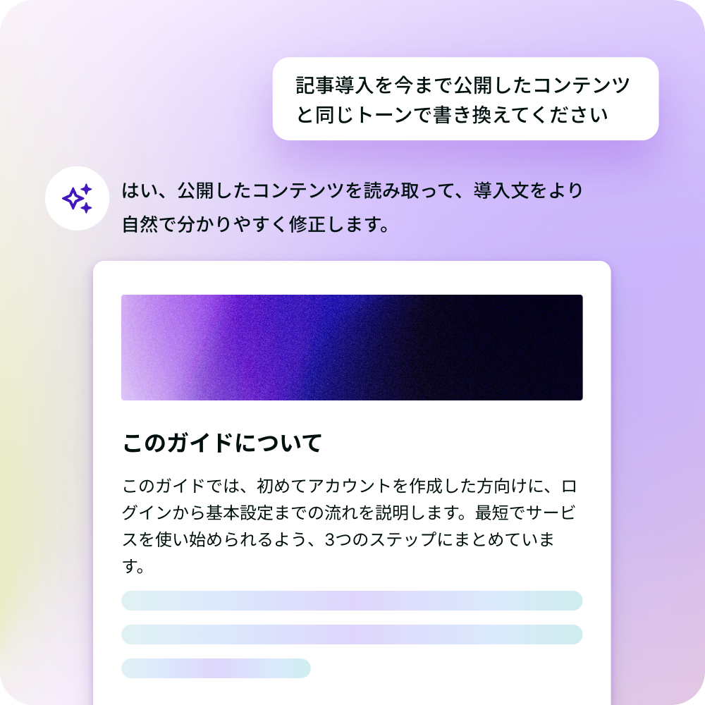 AIがコンテンツの意味や文脈を深く理解するヘッドレスCMS。Copilotによる原稿作成支援やRemote MCPによる運用自動化に加え、コンテンツデータをAIが扱える形式に 変換することで、高精度なFAQ応答や自然言語検索、RAGなどの多様なシーンでの活用を実現します。