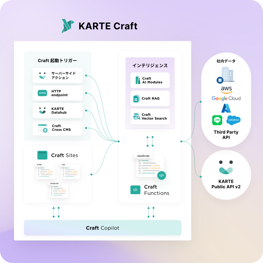 KARTE Craftは、カスタマーデータをトリガーに、AI支援のもと機能やアプリを開発できるPaaSです。開発支援の「Craft Copilot」に加え、「Craft AI」では外部AIモデル接続機能の「AI Modules」、RAG、ベクトル検索といった高度なAI機能群を提供。AIフルサポートで顧客起点な機能開発を実現します。