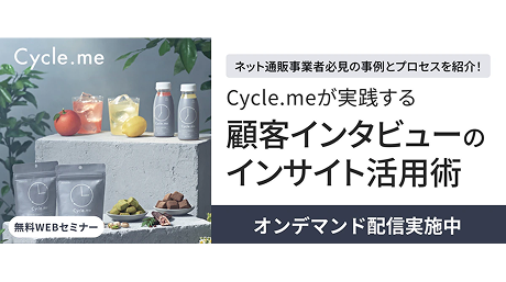 ネット通販事業者必見の事例とプロセスを紹介!Cycle.meが実践する顧客インタビューのインサイト活用術顧客からフィードバックを得る方法やインサイトを突き止める方法、またその顧客データを活用したマーケティング施策について、Cycle.meで実践している具体的な取り組みをケーススタディに解説していただきます。詳細を見る