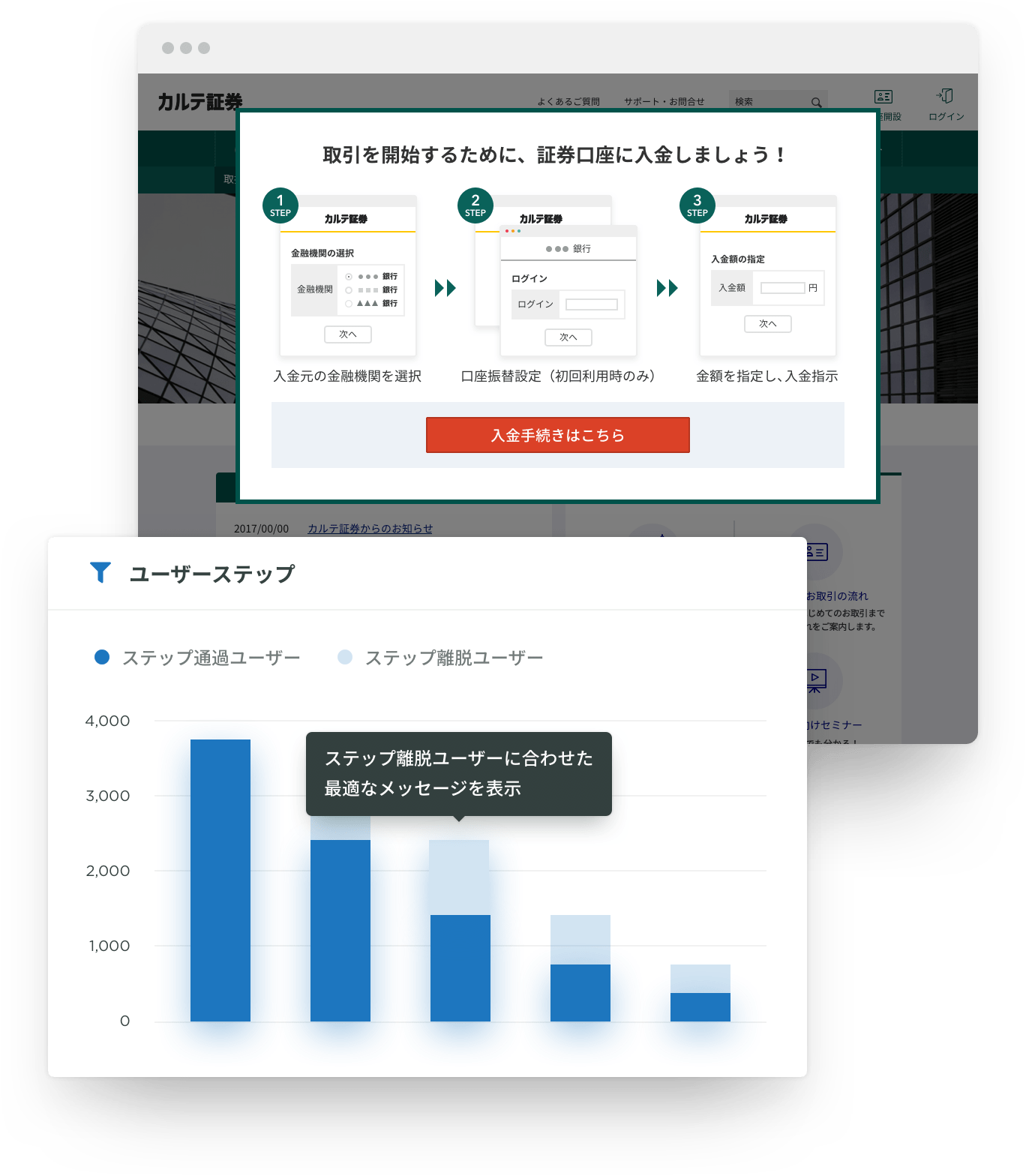 「口座開設後に次のステップである入金手続きが分からない」、「入金完了後にどの銘柄を購入すればよいか迷いなかなか購入に踏みきれない」といった挫折ポイントに到達したユーザーに対して、次のアクションを促すようなポップアップを表示します。